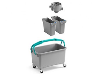 Double BUCKET: Secchio doppio per separare l'acqua di risciacquo dalla soluzione detergente. Paratia centrale rimovibile. Capacità Lt.20. E' una soluzione a ingombro ridotto per la pulizia professionale di piccoli ambienti. Completo di ruote. Dotato dello strizzatore professionale O-Key senza fondo, permette il lavaggio sia con mop che con il sistema wet system.